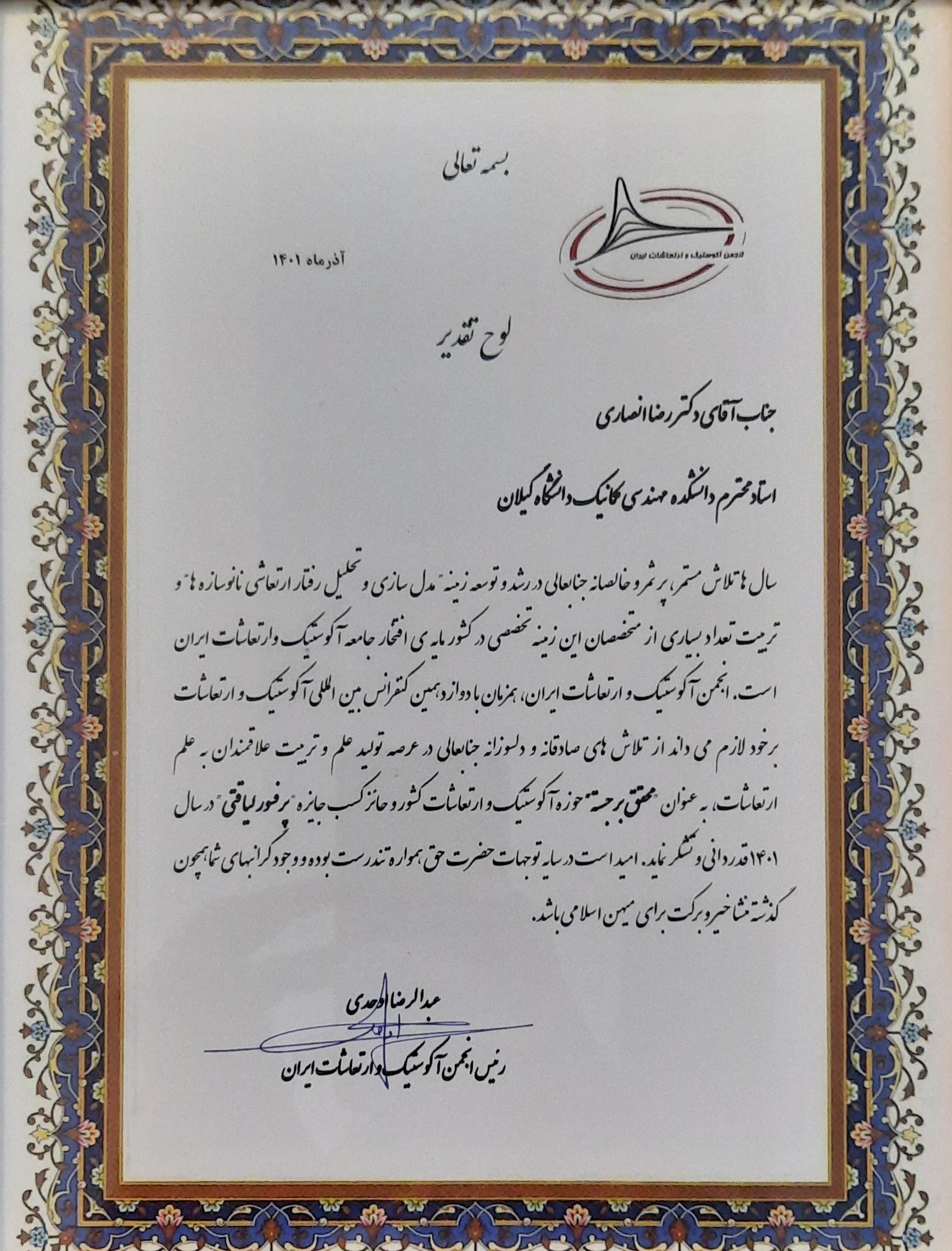 انتخاب دکتر رضا انصاری خلخالی به عنوان محقق برجسته حوزه آکوستیک و ارتعاشات کشور