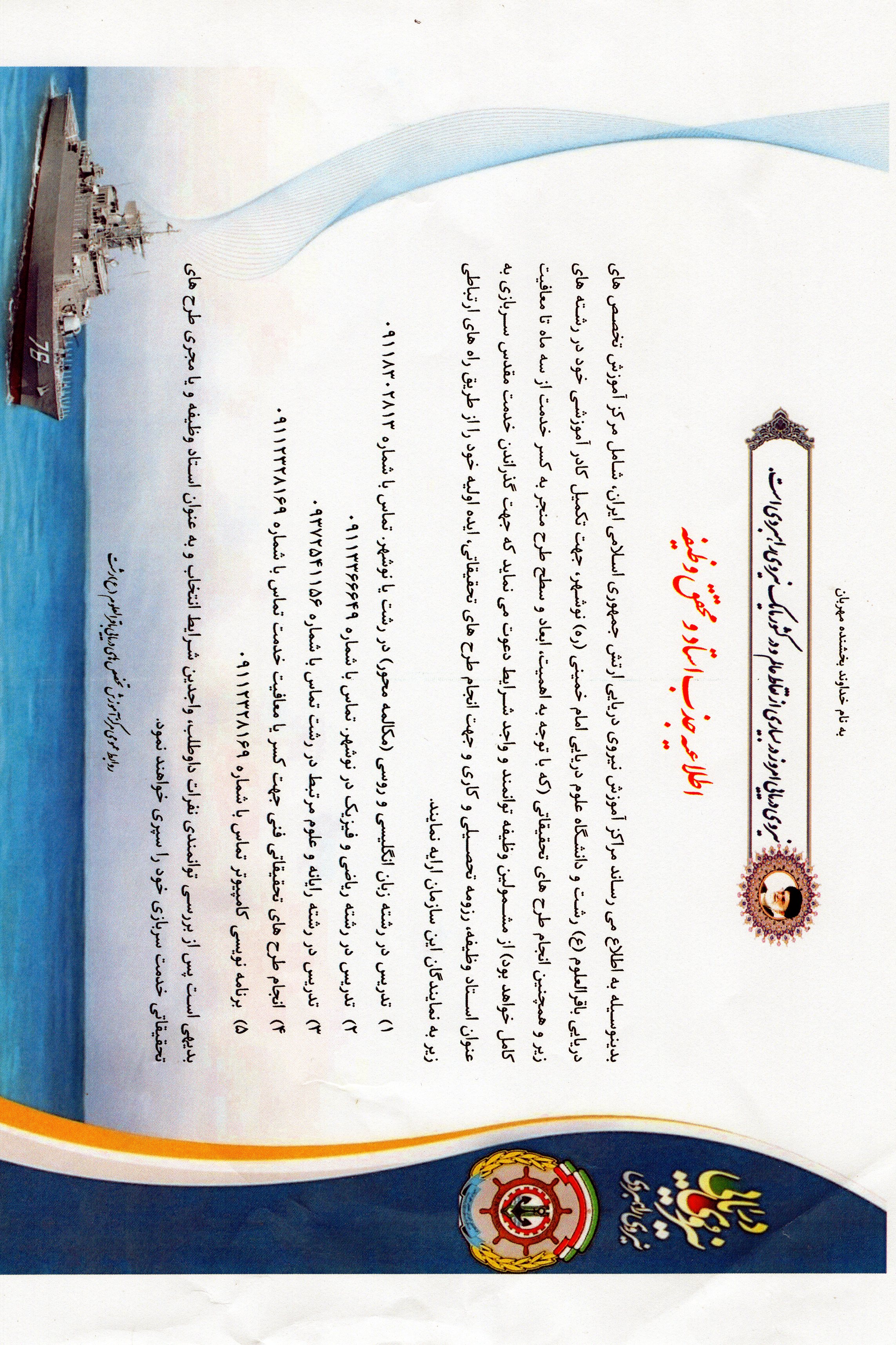 اطلاعيه جذب استاد و محقق وظيفه و دعوت به همکاري در پروژه هاي پژوهشي و تحقيقاتي در مراکز آموزش نيروي دريايي ارتش جمهوري اسلامي ايران